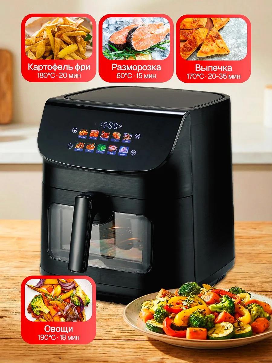 Умное управление (Smart-контроль): 10 автоматических программ: Картофель фри, куриные крылышки, целая курица, рыба, стейк, креветки, пицца, овощи, торт, разморозка. Достаточно выбрать продукт — прибор сам установит оптимальные время и температуру. Ручная настройка: Гибкая регулировка температуры (от 80°C до 200°C) и таймера (до 60 минут) для творческих задач. Автоматическое отключение по окончании программы.