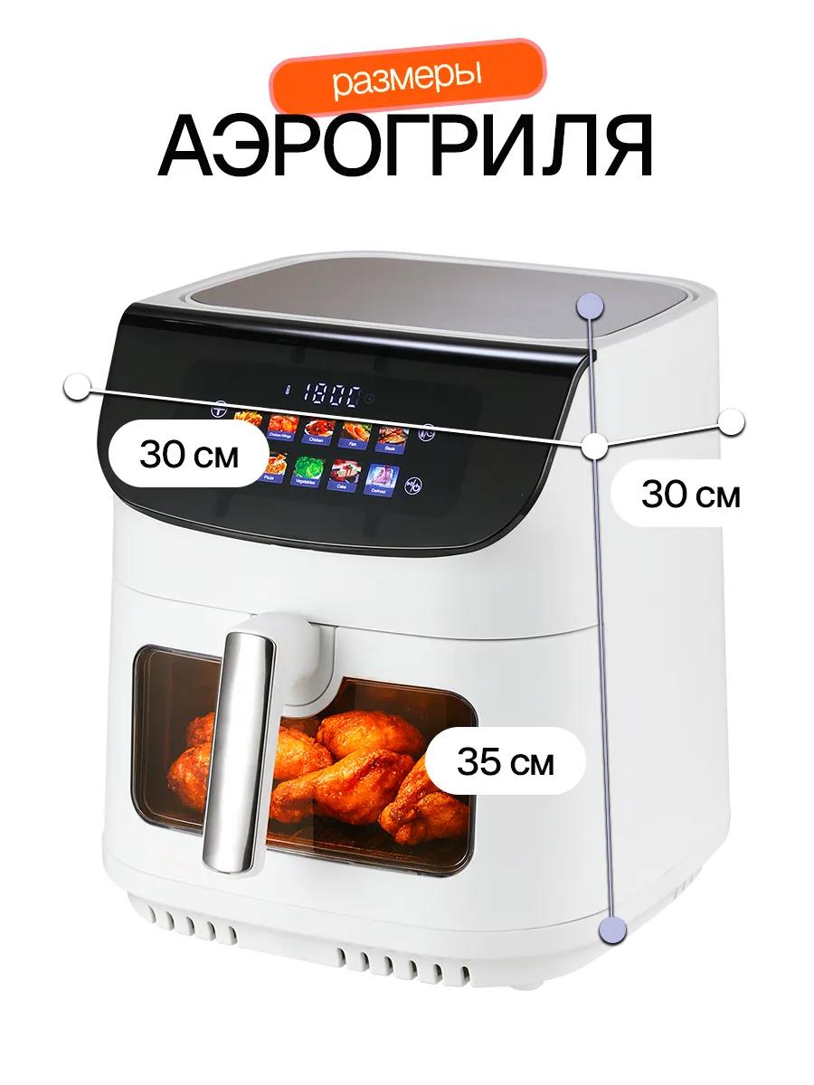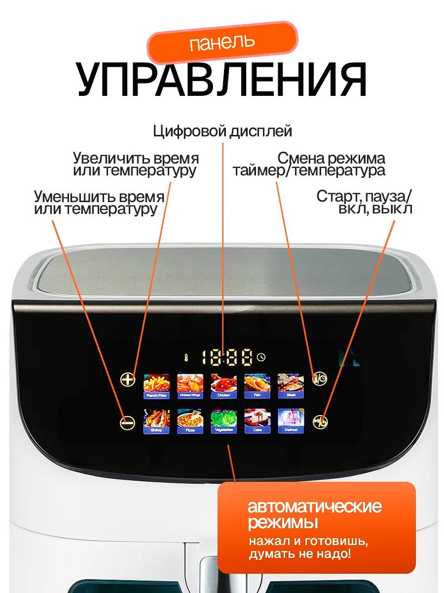 Мощный аэрогриль белого цвета Eltronic 777-01: Два ТЭНа и 9 литров для идеальной готовки. 10 автоматических программ — интеллектуальные настройки для мяса, рыбы, овощей, выпечки и других блюд. Просто выберите режим — прибор всё сделает сам. Интуитивный сенсорный контроль — цветной дисплей, точная регулировка температуры (80-200°C) и таймера (до 60 мин). Смотровое окно с подсветкой для контроля.