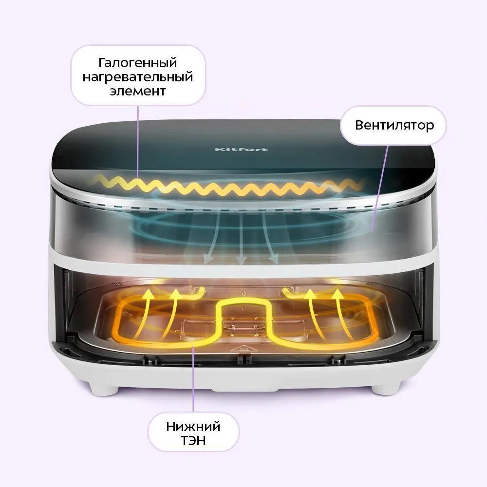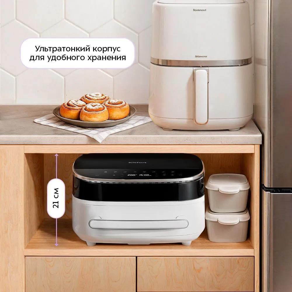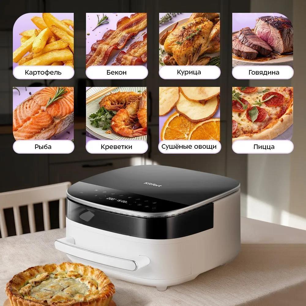 Два нагревателя для равномерной готовки Галогеновый нагреватель готовит горячим воздухом и ИК-излучением, делая румяные корочки. Нижний ТЭН подогревает поддон снизу, что позволяет блюду пропечься со всех сторон. Вентилятор равномерно распределяет тепло, исключая непропечённые участки. 10 автоматических программ Программы позволяют использовать готовые шаблоны настроек, разработанные специально под конкретные блюда, поэтому вам не придётся настраивать температуру и время приготовления самостоятельно.