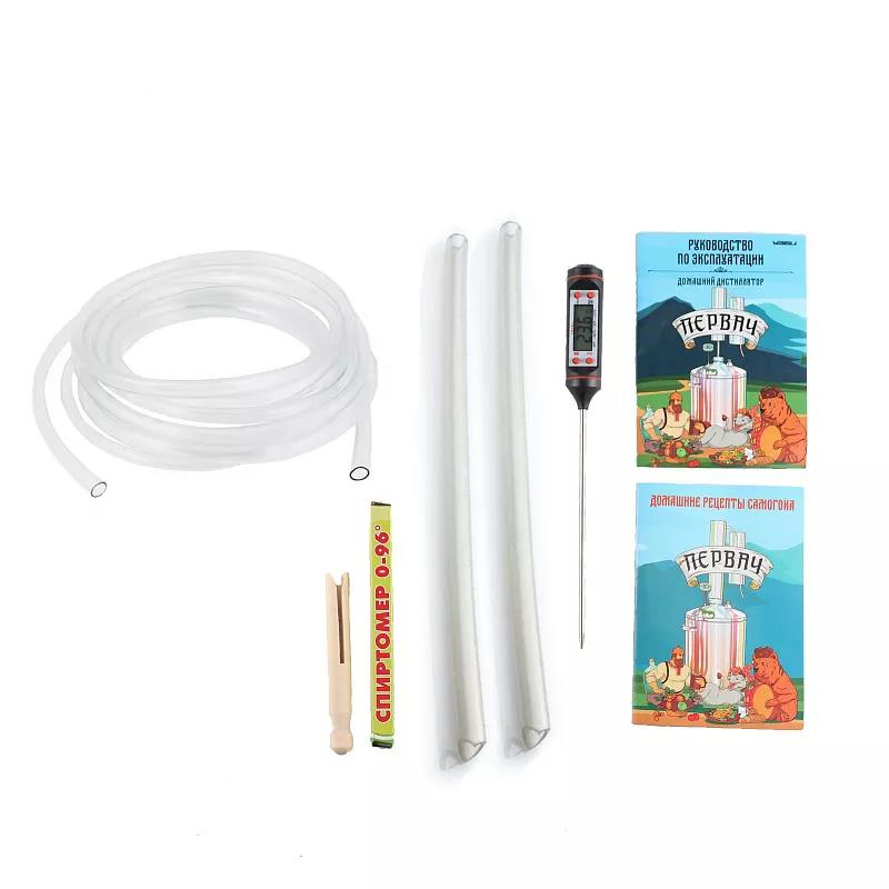 Дистиллятор – устройство для домашнего использования, все компоненты которого произведены из высококачественных материалов. Модели необходим всего час, чтобы осуществить переработку двух литров жидкости. Основной бак устройства вмещает не менее 20 литров жидкости, которая отправляется в гофрированный шланг-охладитель для последующей конденсации. Благодаря встроенному термометру и клапану Вы сможете контролировать уровень давления в данном дистилляторе. Для нагревания устройства сгодится любой внешний источник – подойдет даже стандартная газовая плита. Основная емкость модели произведена из качественной стали, а в ходе изготовления стыков устройства использовалась аргоновая сварка, благодаря которой дистиллятор не подвержен коррозии.