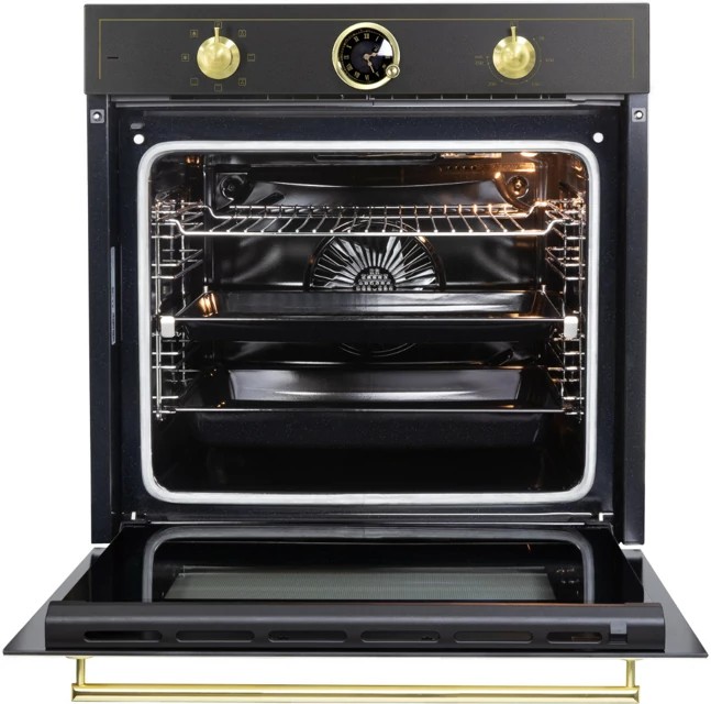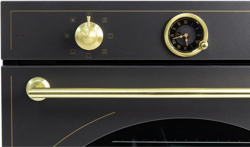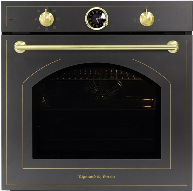 Встраиваемый электрический духовой шкаф Zigmund Shtain E 166 B в черном цвете, станет отличным дополнением к классической кухне. Модель сочетает в себе элементы декора, ручки цвета матированное золото, стекло авторской формы в ретро стиле и современные технологии.