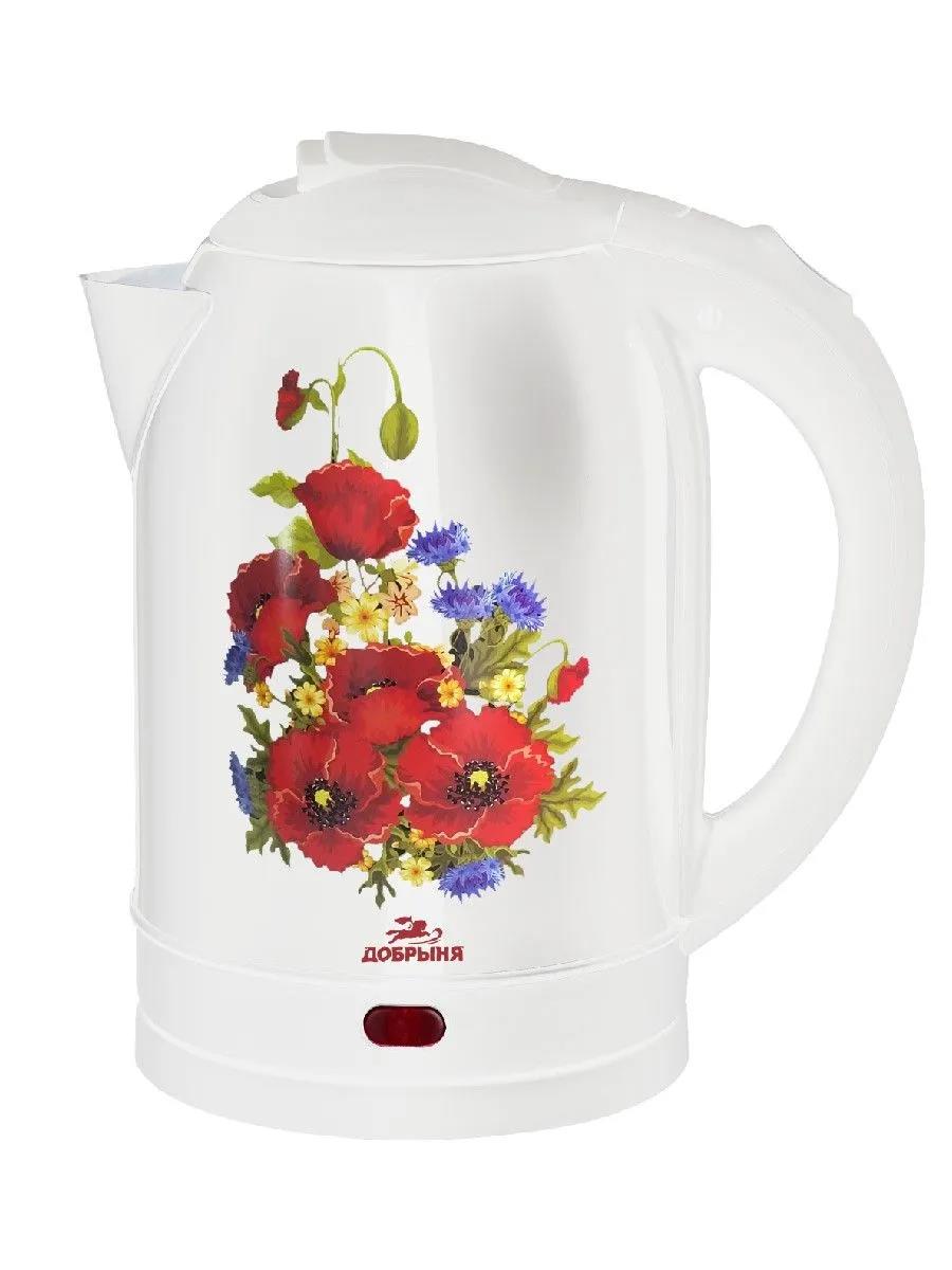 Электрический чайник Добрыня DO-1257 (2,0л) 2000Вт нжс Маки на белом (2200 Вт/2 л /металл/белый, рисунок) - Интернет-магазин У Гриши: бытовая техника, электроника, товары для дома и др.