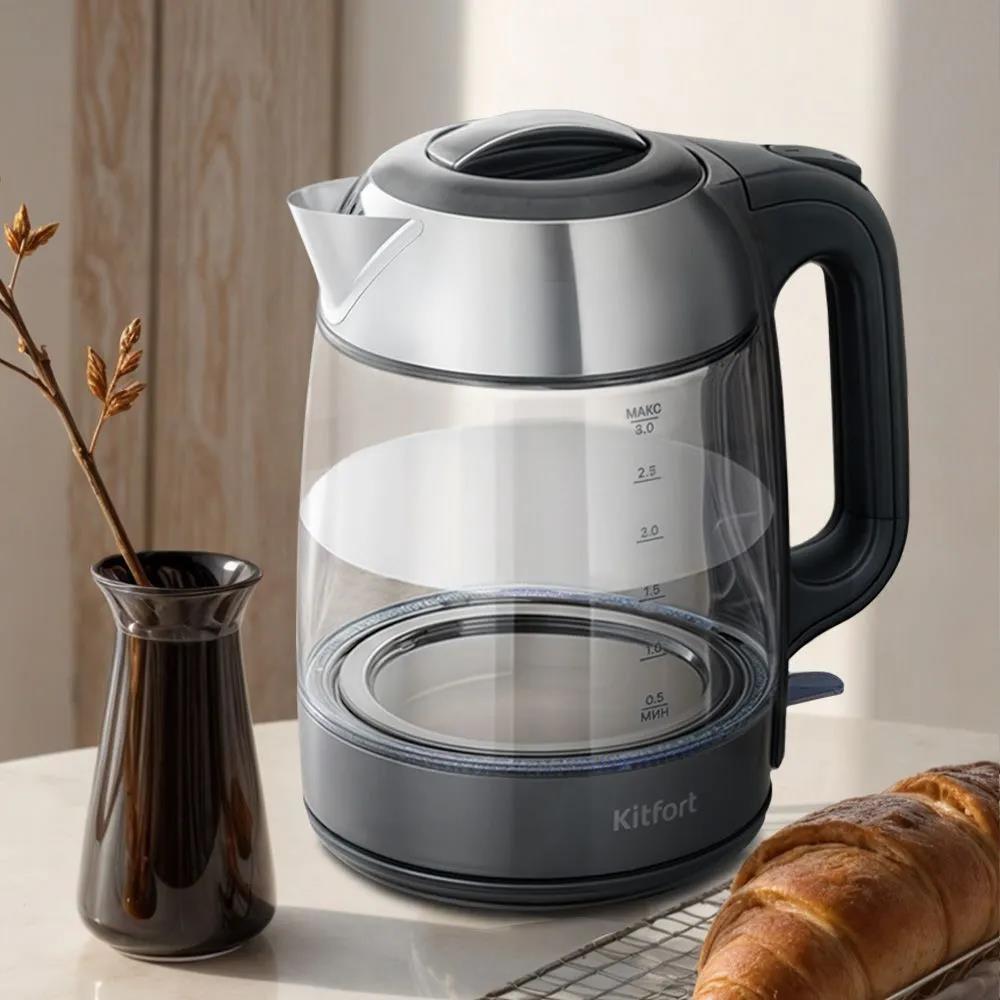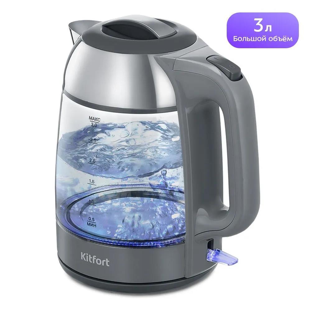 Электрический чайник Kitfort КТ-6762 (2000 Вт/3 л /стекло, пластик, нержавеющая сталь/серый, прозрачный, серебристый) - Интернет-магазин У Гриши: бытовая техника, электроника, товары для дома и др.