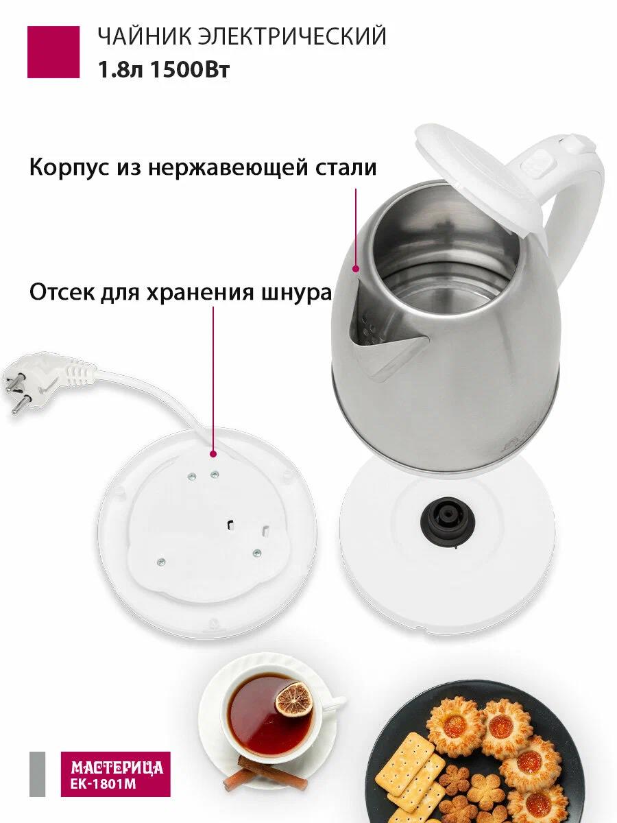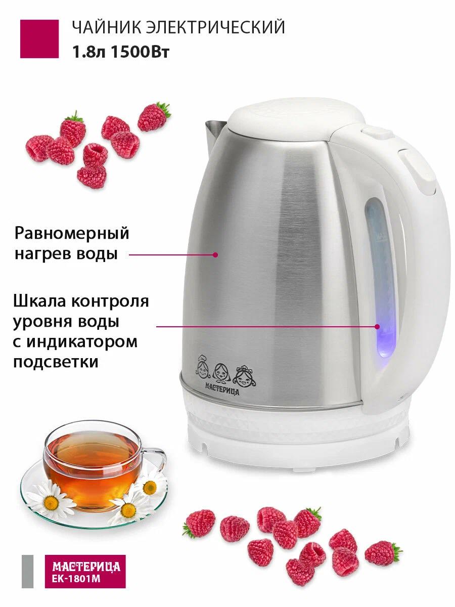 Электрический чайник Мастерица EK-1801М (1500 Вт/1,8 л /металл, пластик/белый, нержавеющая сталь) - Интернет-магазин У Гриши: бытовая техника, электроника, товары для дома и др.