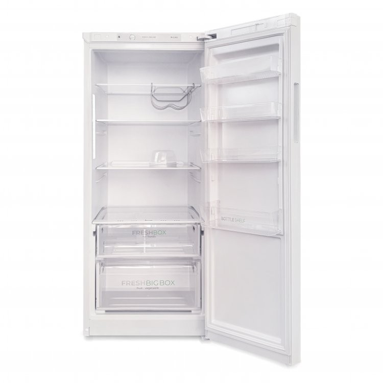 Современный однокамерный холодильник Бирюса 6142 укомлектован 2-мя ящиками под овощи с контролем влажности и 4-мя полками. Также в комплектацию входят подставка для яиц, масленка, а также подвестная полка для бутылок.