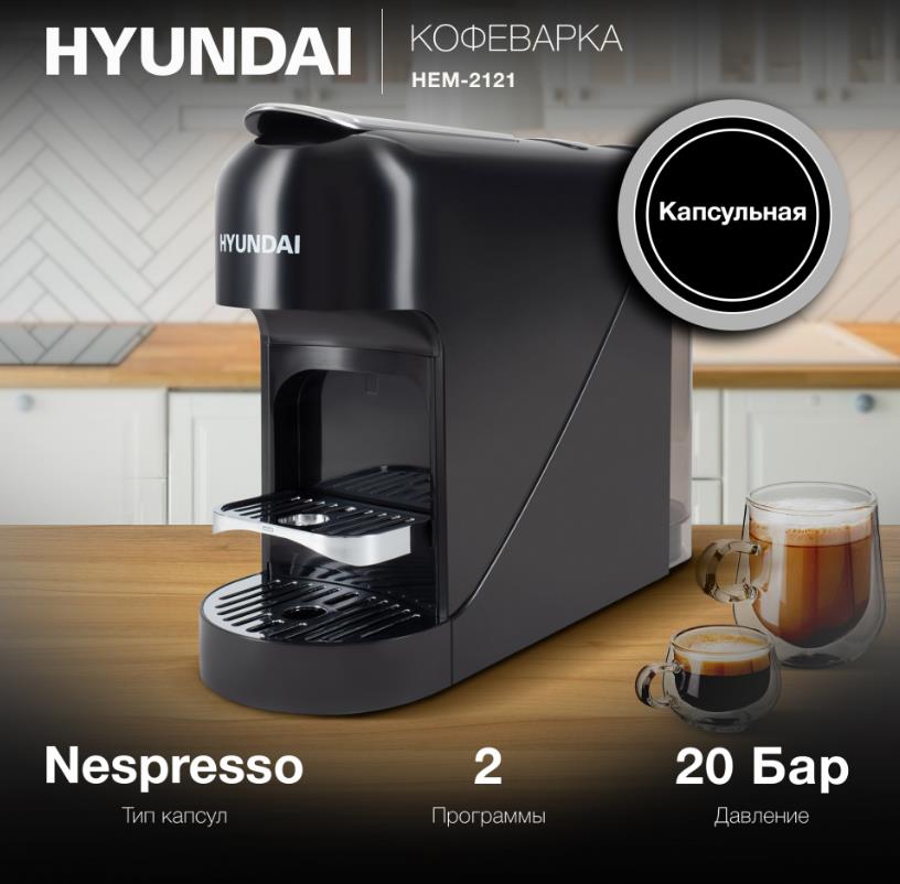 Кофеварка Hyundai HEM-2121 черный (капсульная/0,9 л /1400 Вт )