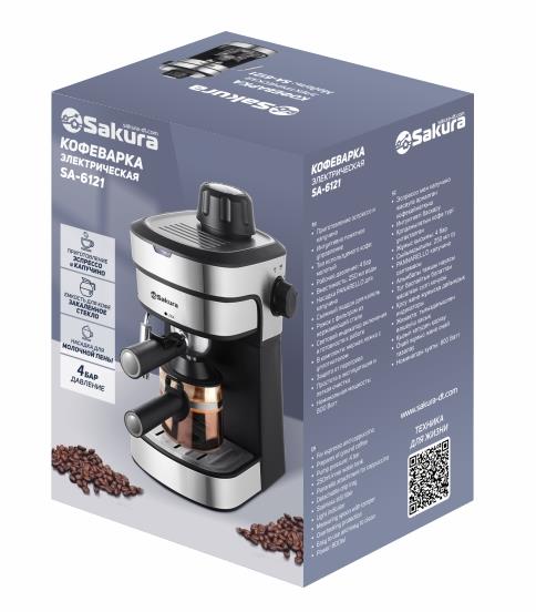 Рожковая кофеварка, приготовление эспрессо и капучино, вместимость 0,25 л, емкость для кофе из закаленного стекла, 4 бар, насадка для капучино, съемный поддон, рожок с фильтром из нержавеющей стали, мерная ложка с уплотнителем в комплекте, 800 Вт. Длина шнура 0,8 м.