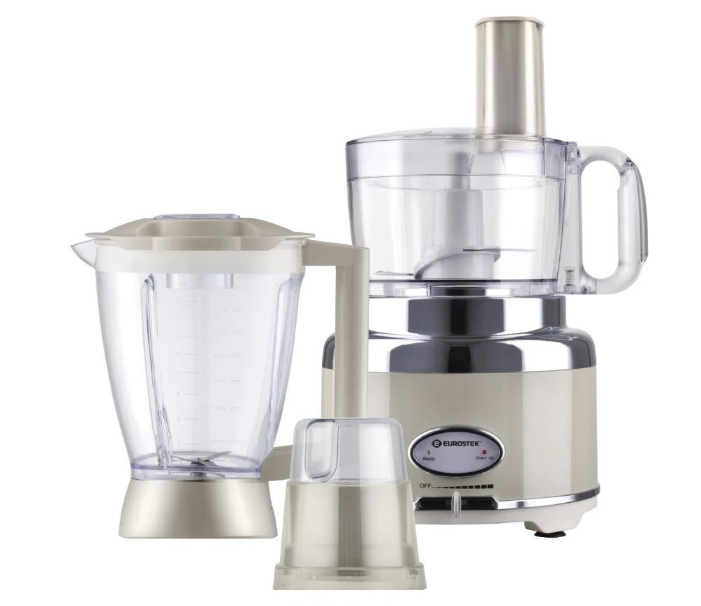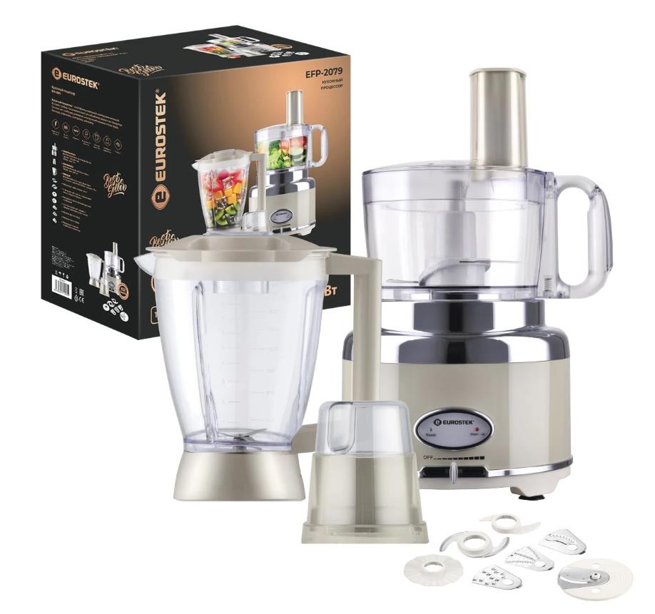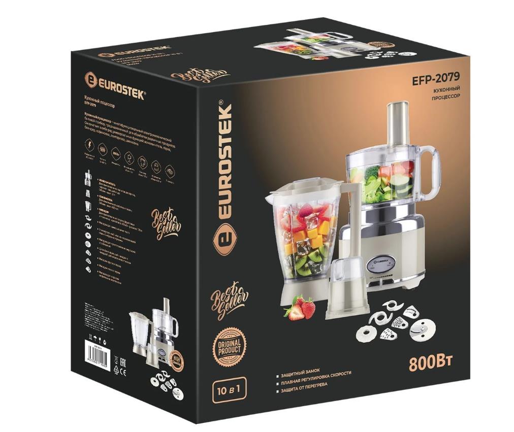 Кухонный комбайн "Eurostek" EFP-2079 Максимальная мощность 800Вт; металлический корпус, плавная регулировка скорости; измельчитель 1.2л., блендер 1.75л., кофемолка. Стальные лезвия измельчителя; диски для размягчения, получения эмульсий. Нарезка тонкими ломтиками, шинковка, приготовление жульена, картофельная терка - с 4-мя вставками