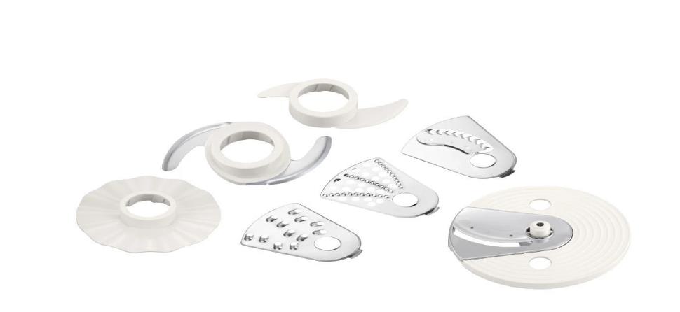 измельчитель, эмульсионная насадка, диск для шинковки, диск для картофеля-фри, терка, универсальный нож, насадка для теста, Ломтерезка