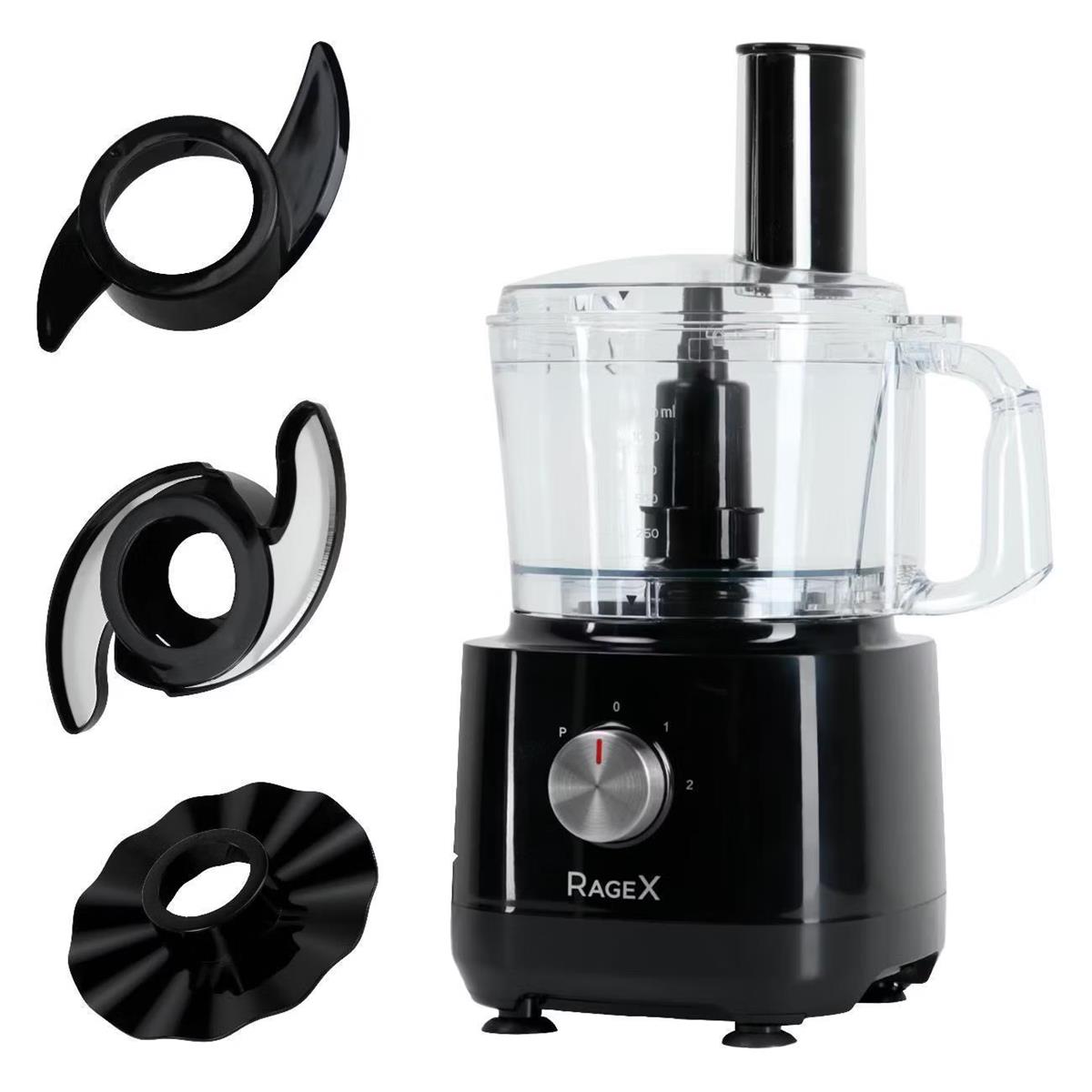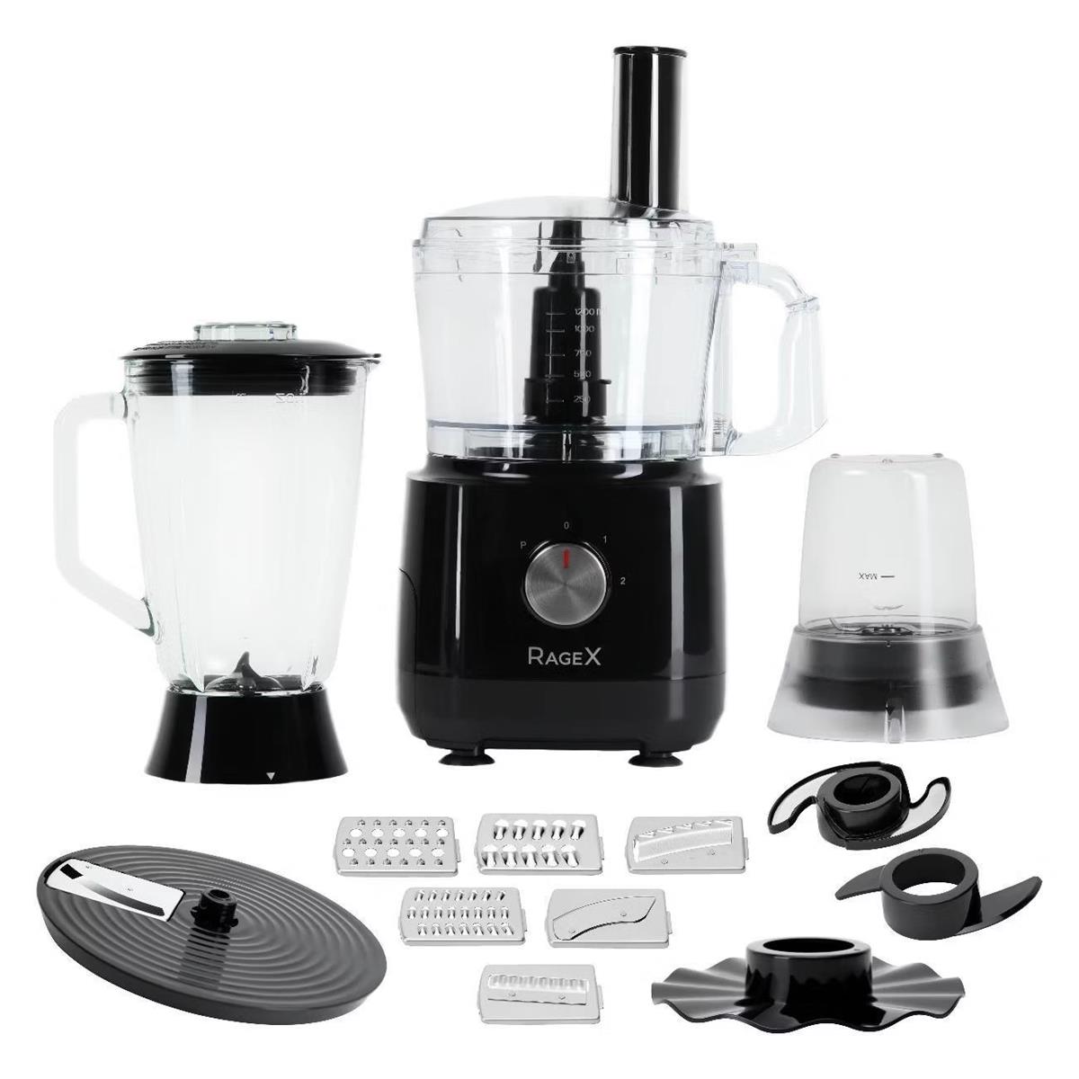 Электрический кухонный комбайн 12 в 1 с чашей из пластика объемом 1.2 л - незаменимый помощник для заготовки фарша, ингредиентов для супа, смузи и детских смесей. Имеет две скорости и импульсный режим, защиту от брызг. Включает в себя большой стационарный блендер с крышкой, резервуар из стекла 1.5 л, нож для измельчения, предназначены для нарезки салатов, мяса, овощей и фруктов. Диск эмульгатор позволит готовить вкусные коктейли, соусы и кремы для десертов. Также предусмотрен пластиковый нож для замешивания теста при выпечке хлеба и блинчиков. Кофемолка емкостью 0.35 л позволяет легко измельчить кофейные зерна, специи или орехи. Набор лезвий из 7 шт: волнообразное, для тонких и толстых ломтиков и соломки, картофеля фри, измельчения. Прочные насадки изготовлены из качественной нержавеющей стали. Толкатель выполнен из безопасного пищевого пластика. Есть лопатка, пластиковая пластина и отсек для хранения лезвий.