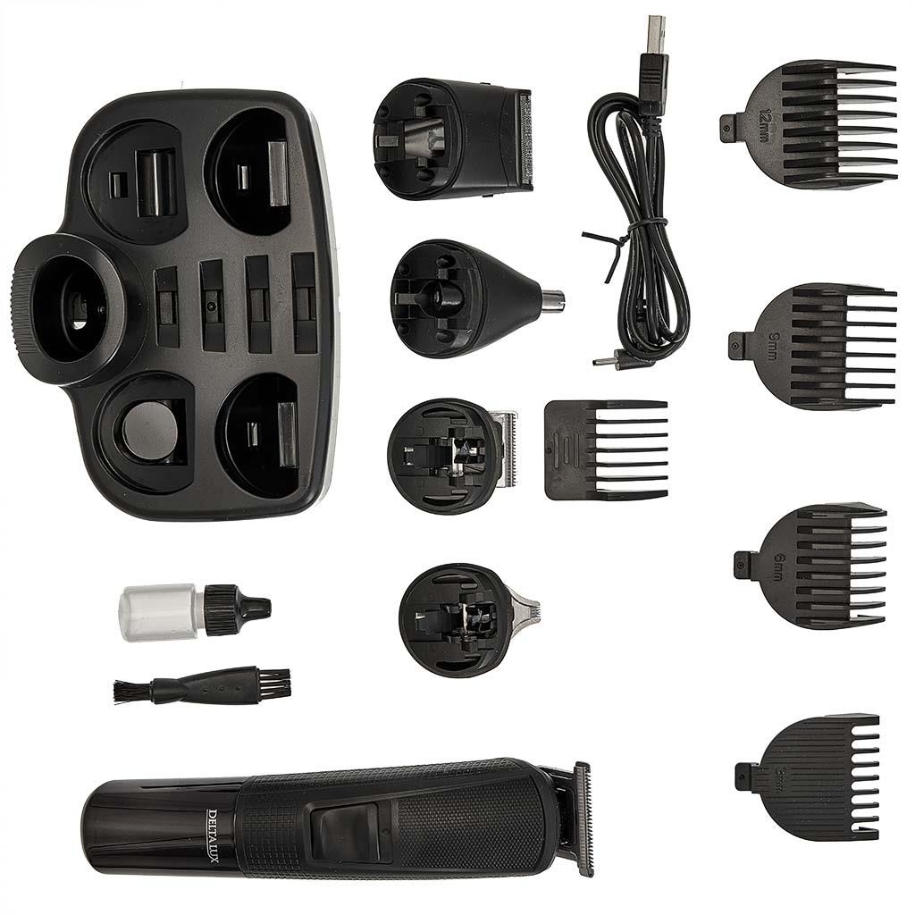 5 съемных насадок: • насадка-бритва; • насадка для коррекции и дизайнерской стрижки; • насадка для носа и ушей; • насадка стандартный триммер; • насадка узкий триммер для подравнивания. 5 съемных гребней: 3, 6, 9, 12 мм, гребень для узкого триммера