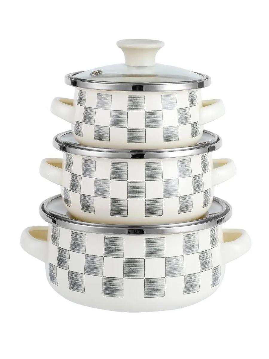 Комплектация 3 кастрюли объемом 0,5 , 0,7 , 1,1 литра и 3 крышки из стекла с ручкой из пластика диаметром 12см, 14 см, 16 см.