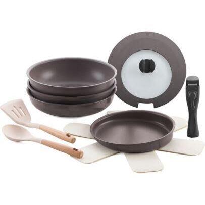 Посуда выполнена из кованого алюминия, обладает высокой прочностью и теплопроводностью. Толстое капсулированное дно подходит для всех видов плит, включая индукционные. Японское антипригарное покрытие Daikin отличается повышенной прочностью. комплектация: Глубокая сковорода - 24 см; Вок - 26 см; Блинная сковорода - 22 см; Универсальная сковорода - 24 см; Защитная прокладка из фетра между сковородами - 2 шт.; кухонная лопатка; кухонная ложка; крышка; съемная ручка