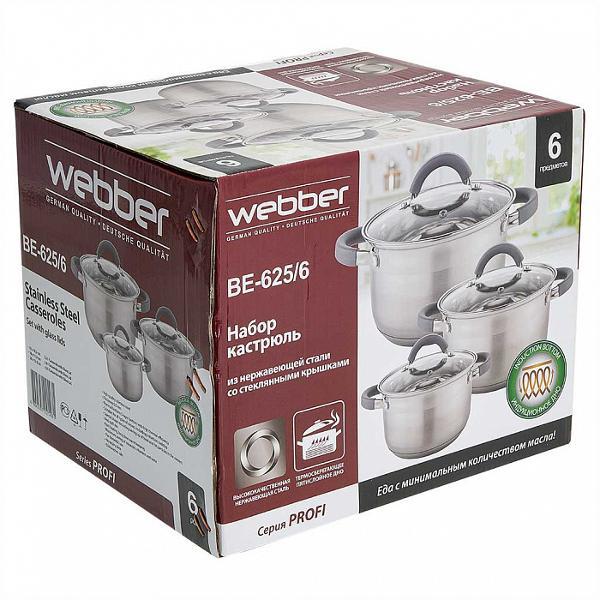 Набор кастрюль Webber BE-625/6 состоит из шести предметов. Пятислойное дно с термоотдачей равномерно распределяет тепло, обеспечивает быстрый нагрев. Корпус и ручка сделаны из нержавеющей стали серебристого цвета. Посуда может использоваться на всех видах плит, включая индукционные, а также в духовом шкафу. В комплекте поставляются три кастрюли объемом 2,2, 3, 4 л. Стеклянные крышки к ним оснащены клапаном выпуска пара. Вес — 3,15 кг.