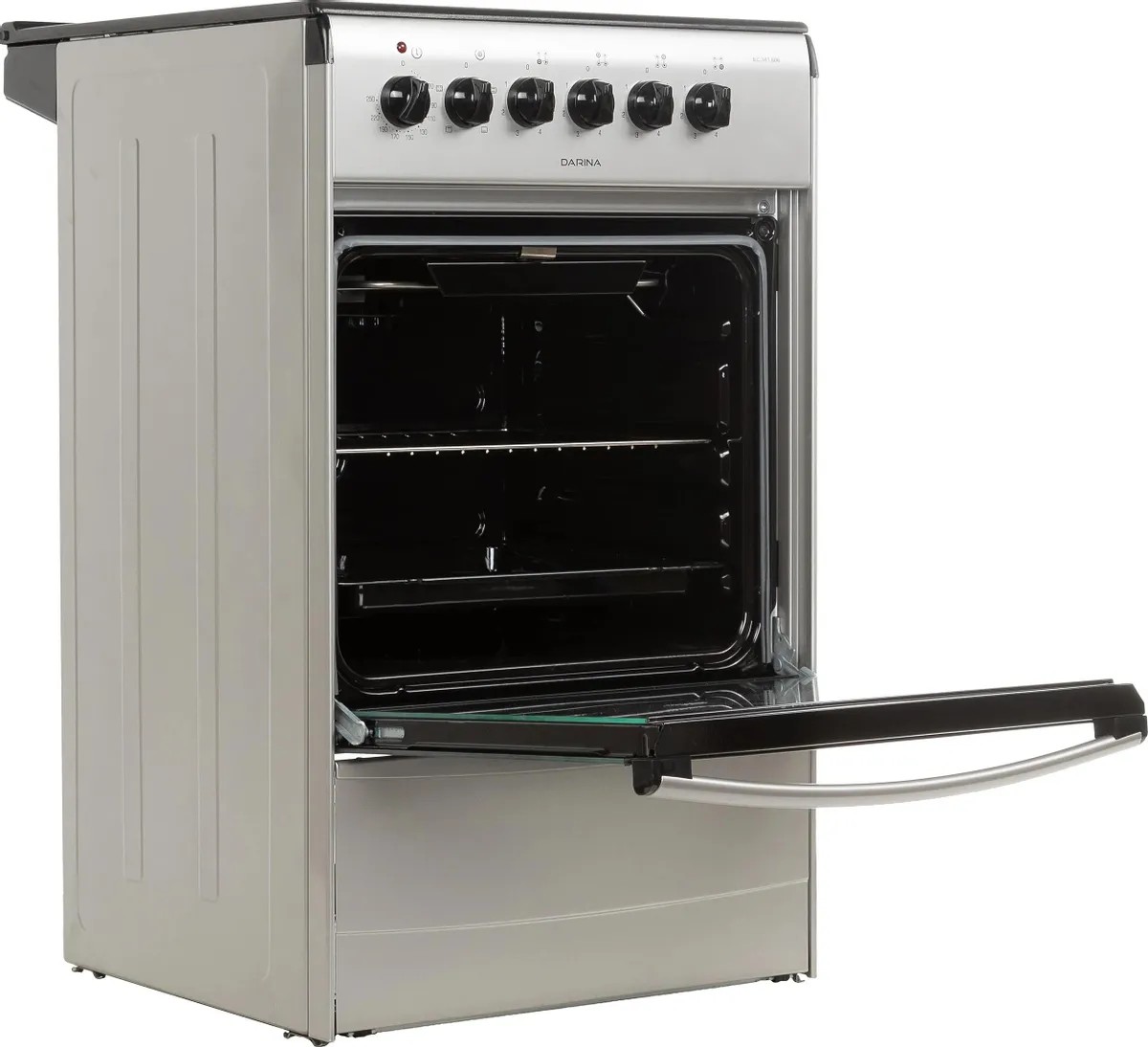 Серебристая электрическая плита в классическом дизайне гармонично впишется в Ваш кухонный интерьер. Она проста и удобна в эксплуатации. Материал поверхности стола – стеклокерамика, такая поверхность удобна в эксплуатации, легко моется, имеет хорошую прочность. Внизу плиты установлен удобный вместительный хозяйственный отсек для хранения кухонных принадлежностей.