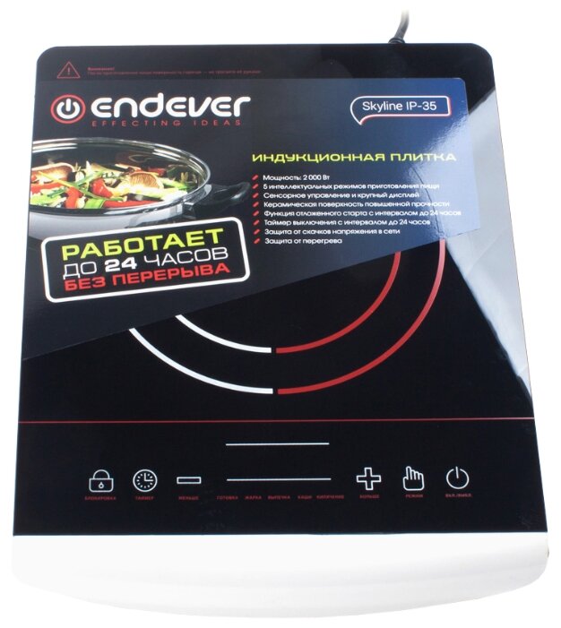 В общежитии или на даче – вам не обойтись без прибора, на котором можно быстро готовить блюда и который не займет много места. Таким прибором может стать плитка электрическая Endever Skyline IP-35. Благодаря компактным размерам и небольшому весу ее можно легко транспортировать и готовить на ней, для этого она снабжена одной конфоркой индукционного типа. И панель, и конфорка изготовлены из прочной и легко очищающейся стеклокерамики, не подверженной царапинам и повреждениям. В устройстве – пять режимов, так что вы можете не только варить или кипятить воду. но и жарить, выпекать, а температура нагрева может варьироваться до 80 до 240 градусов. Управление Endever Skyline IP-35 осуществляется посредством сенсора. Для удобства и полного контроля за процессом можете использовать таймер с отсрочкой запуска до 24 часов.