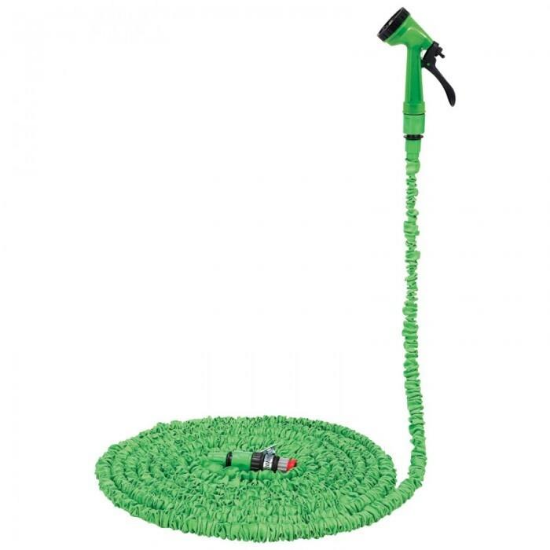 Набор предназначен для хозяйственно-бытового применения: для полива и ухода за растениями для мойки окон или фасадов домов для мытья машин и т. п. НЕ предназначен для перекачки питьевых жидкостей, в том числе питьевой воды. Шланг автоматически увеличивается в длину до 3 раз под воздействием напора воды и уменьшается до первоначального размера при отключении, при этом исключается перекручивание и образование узлов и заломов. Состоит из 2-слойного внутреннего растягивающегося шланга и тканевой оболочки. Специальный растяжной шланг увеличивается в длину в 3 раза. Диаметр 1/2 дюйма. Изготовлен из сверхпрочного латекса, благодаря чему дольше сохраняет форму, выдерживает практически любое натяжение. Состав набора: шланг растяжной (номинальная длина — 5 м, максимальная растяжимость — 15 м) с двумя соединителями, пистолет для полива (7 режимов полива) и адаптер с переходником 1/2 и 3/4.