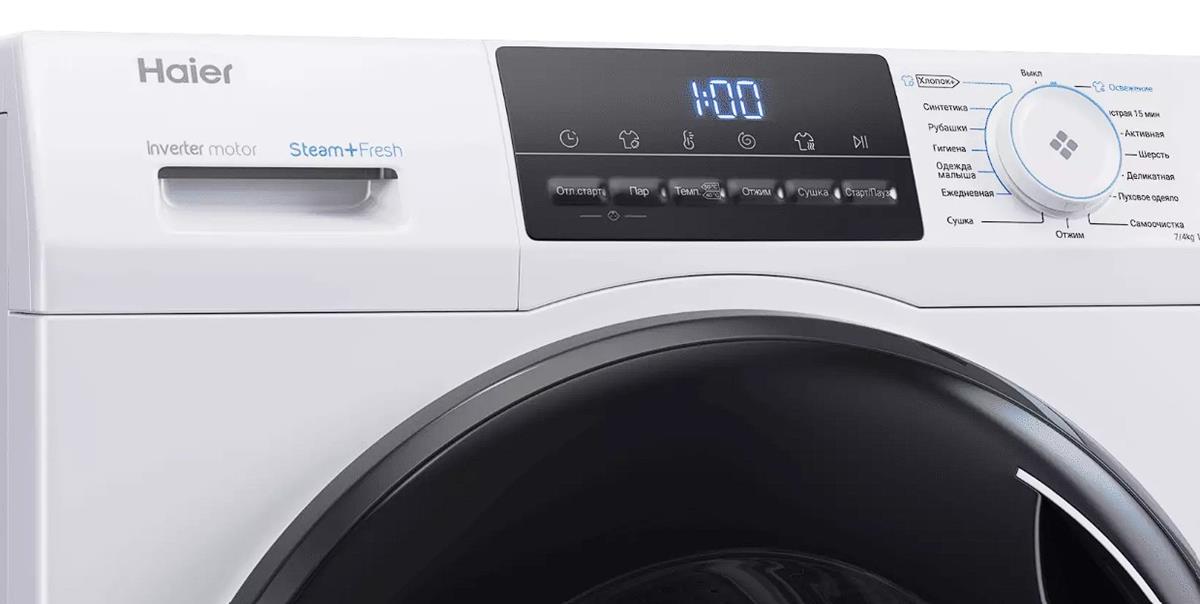 Haier HWD70-BP14929A — узкая стирально-сушильная машина глубиной 45 см, обладающая большой загрузкой для своих габаритов: 7 кг в режиме стирки и 4 кг в режиме сушки. Модель представлена в белом корпусе, с черным LED-дисплеем и затененной дверцей. Ключевые функции: автовзвешивание, благодаря которому машина сама определяет расход воды и электричества, а также режим освежения с помощью пара i-Refresh, позволяющий быстро удалить запахи и складки даже на самой деликатной одежде без применения воды. Управление электронное, для выбора одной из 15 умных программ предусмотрен поворотный селектор. Есть готовые настройки для хлопка, шерсти, пуха, синтетики, спортивной одежды и многих других вещей. Бережное обращение с тканями гарантирует барабан с подушечками Pillow.