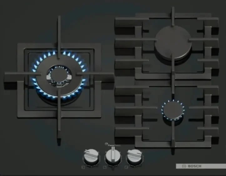 Газовая варочная панель Bosch PPC6A6I40O имеет глубокий чёрный оттенок и идеально ровную закалённую стеклянную поверхность, создающая ощущение минимализма и аккуратности в интерьере.