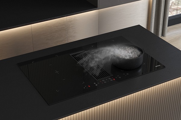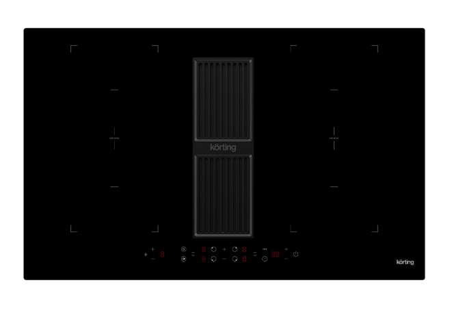 Korting HIBH 84980 NB — это премиальная индукционная варочная панель шириной 83 см, главной особенностью которой является интегрированная вытяжка, расположенная непосредственно в центре рабочей поверхности.