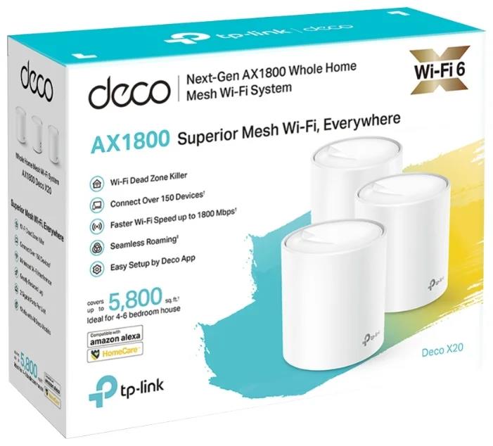 2 устройства Deco X20, 1 кабель Ethernet RJ45, 2 адаптера питания, 1 руководство по быстрой настройке. Метод шифрования WPA3; многопользовательский MIMO; OFDMA; 1024-QAM; стандарты беспроводной связи IEEE 802.11a/n/ac/ax 5ГГц, IEEE 802.11b/g/n/ax 2.4ГГц; mesh-протокол 802.11k/v/r